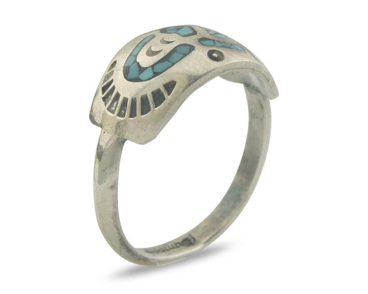 Navajo Ring 925 Silver Inlaid Turtle Turquoise & Coral C.80's Size 6.5