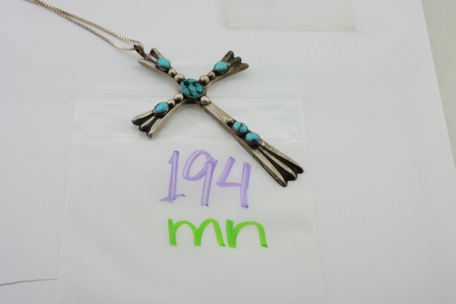 Navajo Sand Cast Cross Pendant 925 Silver Turquoise Signed RJ SILVERSMITHS C.80s