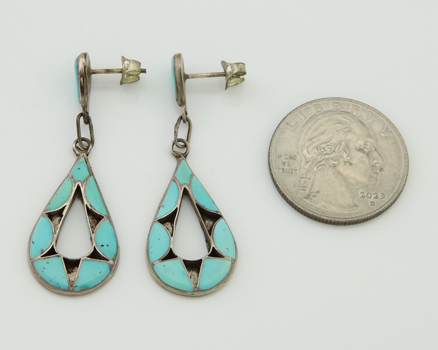 Zuni Dangle Earrings 925 Silver Natural Turquoise Native American Artist C.80's